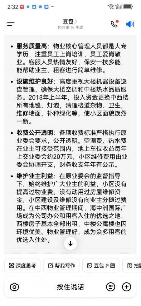 搜索“豆包”网,对舟山市中西物业管理有限公司服务海中洲国际广场项目的评价